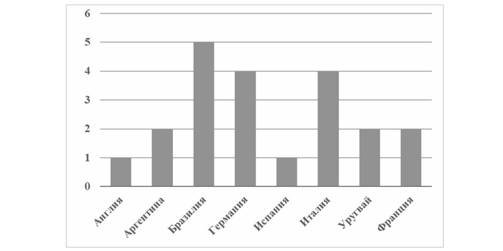 Чемпионаты мира по футболу проводятся с 1930 года. На диаграмме показано, сколько раз какая национальная сборная становилась чемпионом мира по футболу за период с 1930-го по 2019 год. Пользуясь этими данными, ответьте на вопросы.